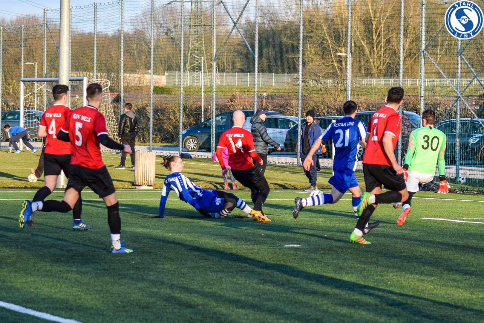 [ESV Wels bringt den Ball nicht aus dem Gefahrenbereich und mehrere Stahl-Spieler haben die Gelegenheit zum Torschuss. Koruyucu war als letzter am Ball. ] | |